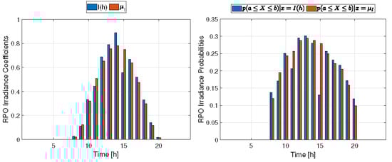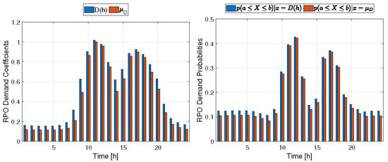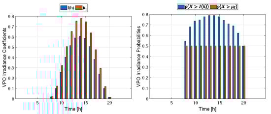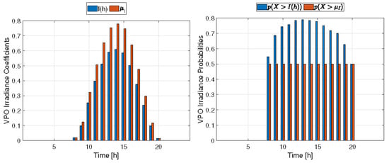For simulations under VPO (Equations (24) and (21) for demand and irradiance, respectively, in the objective function), results are summarized in Table 3 and detailed with coefficients and probabilities in Table A5. The demand coefficients’ profile and probabilities are illustrated in Figure 5 while those of the irradiance coefficients are depicted in Figure 6.