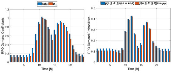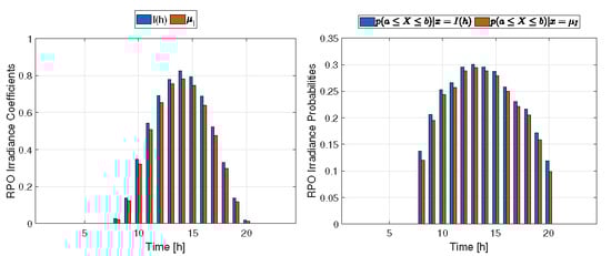 Simulation results for the J23 test system under RPO (Equation (19) in the objective function) are summarized in Table 5. The profiles outlined by demand coefficients and their probabilities are depicted in Figure 7, while the profiles for irradiance and probabilities are shown in Figure 8 (see Table A6 in the Appendix A for detailed hourly modulating coefficients and their associated probabilities).