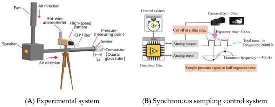 In the research of FTF, it is necessary to prevent the reflection of the speaker−induced sound wave at the outlet of the combustor. Therefore, the length of the combustion chamber (in the form of a quartz glass tube) downstream of the swirler is limited to 100 mm. Such a short pipe causes the acoustic wave to pass through the flame and diffuse to the environment without retro−reflection. For studying the self−excited combustion instability, different combustion chamber lengths were then installed, leading to combustion instabilities with different dominant frequencies and amplitudes. The lengths of the combustor ranged from 500 to 900 mm, and the inner diameter was 100 mm. The flame image was photographed at a high frequency using IDT’s Y5 series high−speed camera with a methyl (CH*) filter. The center wavelength was 430 nm, and the bandwidth was 10 nm, the exposure time was 400 µs and the sampling frequency was 2000 Hz. The high−frequency pressure changes upstream of the swirler were measured, in a synchronized manner, while the flame oscillations were being photographed. Figure 1B shows the synchronous control system. The time over which the samples were taken was 1 s, and the pressure was sampled in the middle of each exposure.