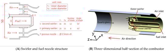 Figure 2 shows the swirler and fuel nozzle structure. A porous fuel nozzle was used to establish a diffusion combustion mode. In the central axis direction, the antidromic pressure gradient caused by the swirling centrifugal force helps produce the central recirculation zone, in which the successive flame resides. The counter−swirling air jets promote the mixing of the air and the fuel. Figure 2B shows a three−dimensional half−section of the combustor. A large swirling flow velocity exists in the venturi, and it is a challenge to balance the flame and air velocities. The fuel is gradually mixed with air and burned at the head of the combustor, and the flame in the combustor is mostly blue, with a small amount of orange flame. Due to the high velocity of the swirling jets, the flame mainly exists behind the venturi. The nozzle supplying the fuel to the combustion chamber is of the porous type. The swirl numbers of the primary and secondary swirlers are 1 and 0.8, respectively.