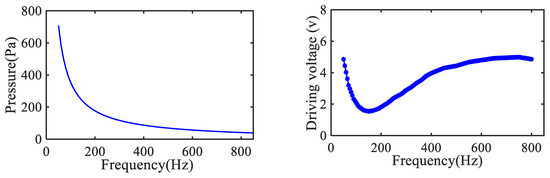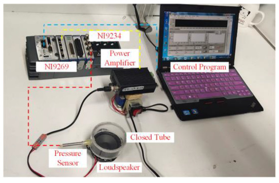 The relationship between the driving voltage of the loudspeaker and the acoustic pressure is measured in a special environment. The verification standard is to ensure that the loudspeaker generates a constant velocity disturbance. Figure 3 shows the loudspeaker calibration system. The loudspeaker is installed at the end of a short tube 30 mm in length. The other end of the tube is closed, meaning that the impedance at the end is infinite. According to acoustic theory, the acoustic impedance at the sensor installation position is , where is wave number and is length. According to , where is velocity wave, the acoustic pressure amplitude at the sensor position is . Figure 4 shows the verification results of acoustic pressure amplitude and driving voltage of the loudspeaker when the velocity amplitude is fixed. From this, it appears that the speaker has obvious nonlinear characteristics.