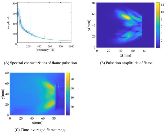 Dynamic mode decomposition (DMD) was adopted [37] to complete the mode decomposition of the CH* images and obtain the dominant frequency and the pulsation distribution. Figure 5 shows the DMD results in Case A when subject to a speaker frequency of 250 Hz. The spectral analysis in Figure 5A indicates that the flame pulsation presented a dominant frequency equal to the forcing frequency. Figure 5B shows the amplitude distribution. The unit in the of the original images is the gray value. The results display the pulsation characteristics of the various regions of the flame.