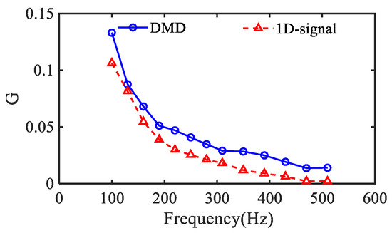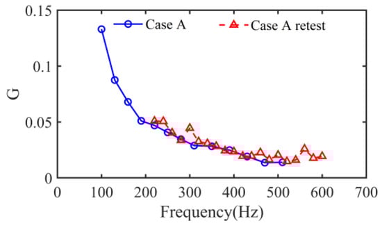In previous studies, traditional analysis methods such as photomultiplier tubes were used, which treated the flame as a whole synchronous movement and then obtained the amplitude of the one−dimensional signal of flame pulsation. Nevertheless, the flame shows periodic pulsation under acoustic forcing. The present study introduced the DMD method to quantitatively calculate the flame pulsation amplitude. Figure 6 presents the comparison results, which indicate that the DMD method is more accurate than the one−dimensional processing. In addition, Figure 7 presents the results of some repeated measurements of Case A, which confirms the validity of the results in this study. With regard to FTF, more detailed frequency resolution is always desirable and the resulting curve is smoother [38,39]. However, this greatly increases the difficulty of the experiment. Based on the repeatability measurement results, the frequency step of this research is determined to be 20~30 Hz.