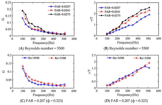 The FTF also presents an increasing trend, which benefits from the incremental flame front. However, this phenomenon is confined to the relatively low−frequency range. For example, in the case where the frequency exceeds 300 Hz, the effect of the equivalence ratio on the gain of FTF is weakened. The relative convection time presents significant differences with changes in equivalence ratio, and the flame pulsation has a reduced convection time under a lesser equivalence ratio, indicating a smaller phase difference. It is also known that the dynamic performance of flame pulsation differs under different Reynolds numbers, which means that the combustion instability problem is also seriously affected by the Reynolds number. Therefore, the present study evaluates the characteristics of flame under a constant acoustic forcing amplitude to reveal variation in combustion instability characteristics under different Reynolds numbers. The inlet Reynolds number has a relatively smaller effect on the convection time but affects the flame pulsation gain more. For larger Reynolds numbers, the heat release rate pulsation increases, and the acoustic forcing amplitude leads to a larger flame pulsation, given that the flame is also releasing its heat in a constant space. The amplitude of flame pulsation caused by high−frequency acoustic wave disturbance is relatively small; at these frequencies, the difference due to the Reynolds number is relatively insignificant.
