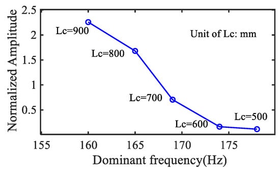 Then, self−excited combustion instability was generated when the combustion chamber length was varied in Case A. Figure 10 shows the oscillation pressure amplitude and the dominant frequency under various geometrical conditions with constant air and fuel inlet conditions. The dominant frequency of oscillating pressure is 160 Hz at = 900 mm. The results indicate that the oscillation frequency of the self−excited combustion instability in this study is close to the acoustic resonance frequency, which confirms the occurrence of thermoacoustic coupling in the system.