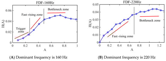 Firstly, with the increase in the disturbance amplitude, the results indicate that the growth in heat output is mainly divided into three stages when the dominant frequency is lower than 200 Hz, i.e., the triggering stage, the fast−rising stage and the bottleneck stage. In the present study, there is no strict standard for the division of the growth process in the FDF at present. However, the FDF is recognizable at different frequencies from its curve. For instance, when there is a clear slow growth stage initially, the approximate position of the trigger zone can be determined. At the later stage of increasing pressure disturbance amplitude, once the flame driving growth has become weak, the growth is no longer obvious or even decreasing, and then the approximate position of the bottleneck stage can be determined.