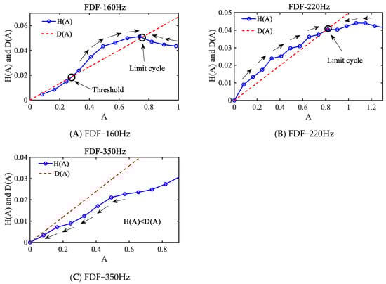 Figure 12A–C depict the changes in the heat release rate and damping dissipation at three typical frequencies (160 Hz, 220 Hz and 350 Hz, respectively). Energy dissipation mainly constitutes the damping of combustion instability. Acoustic waves transmit energy to the environment through the combustion system boundary. On the other hand, energy dissipation also occurs in the form of thermal energy loss. These two aspects are difficult to evaluate in quantitative terms and are usually simplified into linear curves by researchers [32]. In fact, the degree of damping dissipation can be deduced from the amplitude of the limit cycle state. In the present study, the linear damping curve was regarded as a hypothesis to be tested by analyzing the triggering mechanism of combustion instability in combination with the FDF. The results revealed the existence of a trigger threshold of pressure disturbance when the flame pulsation was in the triggering stage. The rate of growth of the heat release rate is relatively lower than the rate of growth velocity of the pressure disturbance amplitude, and it is thus difficult to balance the damping dissipation. Only when the oscillation pressure amplitude exceeds the trigger threshold can it promote the self−sustaining increase in heat release rate amplitude and pressure oscillation, so combustion instability can then take hold and build up to the limit cycle state. Figure 12B shows a frequency at which the trigger threshold does not exist, so the growth of heat pulsations only presents the fast−growing stage and the bottleneck stage. Figure 12C shows that if the driving slope at amplitude zero is less than the damping dissipation, the rate of heat output buildup in each pulsation is still less than the dissipation as the oscillation pressure amplitude increases, and the system is stable. For the model combustor fed with a butane diffusion flame studied in this paper, the stabilizing effect was particularly prominent and typical at frequencies above 350 Hz.