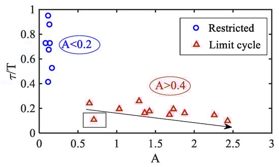 From the drive dissipation model shown in Figure 12A, under strong coupling oscillation, the oscillation pressure and heat release rate pulsation are stable at the limit cycle state, and the flame pulsation is often in the bottleneck period. Figure 13 presents the pressure pulsation amplitude and the relative convection time during combustion instability under different working conditions. The oscillatory condition of the combustion instability is now generally divided into two categories, i.e., the limited state and the limit cycle state. Combustion instability under the limited state and under the limit cycle state is expressed by the blue circle and the red triangle, respectively. The boundary of oscillation states is evident. The pressure oscillation amplitude under the limited state is lower than 0.2, while the convection time is generally greater than 0.4. The pressure oscillation amplitude under the limit cycle state is generally greater than 0.4, but the convection time is relatively short and tends to decrease with the increasing oscillation amplitude. The point marked with a black box is the shortest working point of the combustion chamber, with a smaller pressure oscillation amplitude and a shorter convection time, which was attributed to the fact that the geometric construction ensures a smaller sound pressure feedback at this position in the flame.