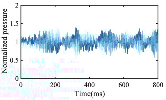 The results described so far reveal a critical amplitude between the trigger stage and the rapid rise stage, i.e., the trigger threshold, which is an inflection point. Below this threshold, flame pulsation grows only slowly with increasing oscillation pressure amplitude, and the driving energy of the heat release rate is lower than the dissipated energy. The driving energy of the heat release rate balances the dissipated energy at the trigger threshold. The pressure pulsation amplitude corresponding to 0.2 falls in the trigger phase of the drive dissipation model, while the amplitude at 0.4 is within the rapid rise period, indicating that two kinds of combustion instability in Figure 13B belong to the trigger phase and the bottleneck phase. The results of this study seem to show that pressure pulsation is a common phenomenon, although strongly coupled oscillation does not occur. For instance, when the flame pulsation shows negativity with increasing levels of oscillation pressure amplitude, the heat release rate pulsation does not cause further increases in pressure pulsation, and under these conditions, the combustion instability is always within the trigger phase. Figure 14 shows the corresponding pressure wave in the time domain. Over this period, the oscillation pressure amplitude maintains a lower level, and the pressure signal generated by combustion instability is in a limited state. The pressure wave is subject to strong instability, and the amplitude is always maintained within 0.4. When the flame shows positivity, the amplitude increase exceeds the trigger threshold, after which the flame pulsation enters the bottleneck stage, and the combustion instability becomes stable in the limit cycle state.