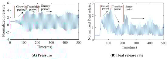 - The growth process of combustion instability is divided into a growth period, a transition period and a steady−state period. Attractor theory confirmed the process of gradual coupling between the acoustic pressure and the heat release rate pulsation. During this stage, the flame caused by the initial ignition produces a pressure expansion that is reflected to the flame from the wall of the combustion chamber to further interfere with the flame and generate the pulsation. The mutual coupling and gains further increase the amplitude of the pressure pulsation and heat release rate pulsation.