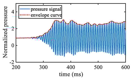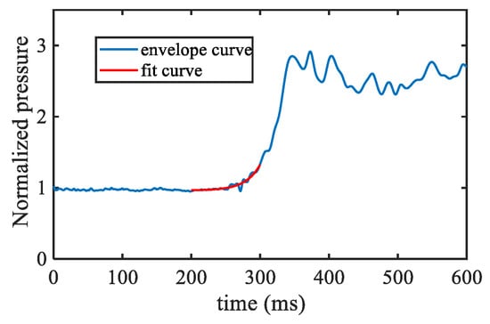In the experiment debugging, the growth process of oscillating pressure and heat release rate is very fast, and it is difficult to catch the growth process in the unstable transition state of combustion by adjusting the working parameters. Therefore, this research adjusts the working parameters to combustion instability state before ignition. Then, combustion instability is triggered through ignition and the growth process is measured. The method of forced ignition can also be found in the literature [37]. In this research, an oscillation pressure amplitude fitting method is proposed to describe the growth rate of oscillating pressure. The mechanism of pressure growth is also described. An exponential fit is applied to the envelope of the pressure signal in the growth period to obtain the growth rate of the oscillation pressure. The exponential fitting formula is shown in Equation (6).