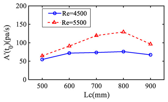 Figure 18 presents the growth rate of the oscillation pressure amplitude within the growth phase. As mentioned above, the dominant frequency increases after shortening the combustion chamber length, and the flame pulsation has a relatively smaller amplitude gain. In addition, the flame pulsation possesses a relatively smaller acoustic pressure response amplitude. Similarly, the heat release rate pulsation caused by the acoustic forcing will lead to smaller pressure feedback, thereby causing a decrease in the growth rate of oscillation pressure amplitude with increasing combustion chamber length. Additionally, a larger Reynolds number produces a greater amplitude growth rate. The airflow velocity is far lower than the velocity of sound, and the increase in Reynolds number will not cause a significant change in the acoustic characteristics of the combustor. Hence, the increase in pressure and heat release rate feedback intensity caused by a larger Reynolds number are mainly a product of the growth of flame gain with an increasing Reynolds number. It is noteworthy that the growth rate decreases when = 900 mm. However, the oscillation pressure amplitude reaches its maximum value under the limit cycle state, a fact that reflects the particularity of the pressure pulsation and heat release rate pulsation feedback process during the growth period. The concept of the attractor structure in chaos theory is then adduced to further explain the phase space trajectory of the feedback process in the growth period.
