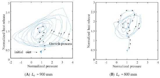 The attractor structure reflects the phase changes of the pressure pulsation and heat release rate pulsation within the growth period. For the case of = 900 mm, it takes four cycles to enter the stable orbit, while for the case of = 800 mm, it takes about three cycles. The phase difference change in the above analysis explains the growth process of the pressure amplitude in the growth period. In the initial period, the phase difference is relatively large, while the growth rate of the amplitude is relatively low. The amplitude growth rate increases with decreasing phase difference. Finally, the amplitude growth slows down until the saturation state (the limit cycle state) is attained, the state which is limited by the FDF. From the period of entering the stable orbit, when the combustion chamber length is 900 mm, the system has a relatively long period, which indicates that although the amplitude of pressure oscillation is small, it has a fast amplitude growth rate benefiting from the short combustion chamber length. The early coupling or the establishment of the resonance state is influenced by the propagation time of the sound wave in the combustion chamber.