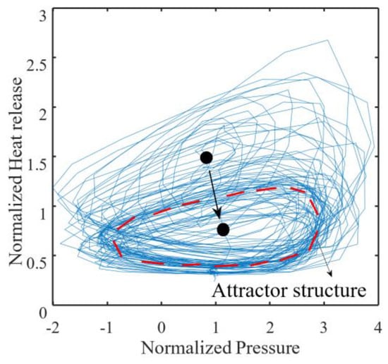 Figure 20 shows the attractor structure during the entire triggering phase; it presents a degree of confusion, which is mainly caused by the random characteristics of the self−exciting combustion instability process. Various forms of interference make the heat release rate pulsation prone to generating phase mutation and random characteristics. The black dot is the approximate center of the trajectory. The central point of the attractor structure is deflected in the steady−state period due to the transition period, and the attractor structure is found to show the motion orbit. However, its structure is not a perfect oval because the heat release rate pulsations are subject to non−linear fluctuations, with the result that it has a waveform that deviates from the sinusoidal through a superimposed ripple. In addition, a deflection angle between the steady−state attractor structure and the growth attractor structure is also evident. No phase relation has been established between the pressure pulsation and heat release rate pulsation within the growth period. However, this phase relation may adjust in the transition period and tends to be stable in the steady−state period.