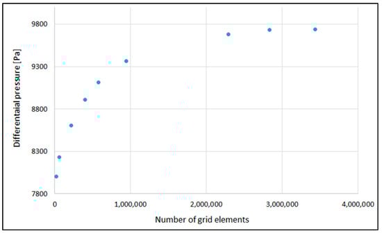Before proceeding to the relevant numerical calculations, tests were carried out on the influence of mesh density on the results of the modeled calculations. Test calculations were performed for nine grids with different numbers of elements. This analysis concerned the flow of fluid through a standard orifice. The results of these calculations are presented below in graphical form in Figure 2.