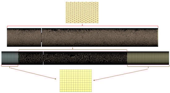 Figure 3 shows the computational grid used in the study. A hybrid grid was used, which was a combination of a structured and unstructured grid. Such division of the computational area made it possible, first of all, to significantly reduce the time scale of the calculations carried out without risking the loss of accuracy of the obtained results. The area was divided in such a way that in places where not much happened, the structural grid was used, and in the areas of the greatest disturbance and the area of potential impact of the applied orifice, the unstructured grid was used.