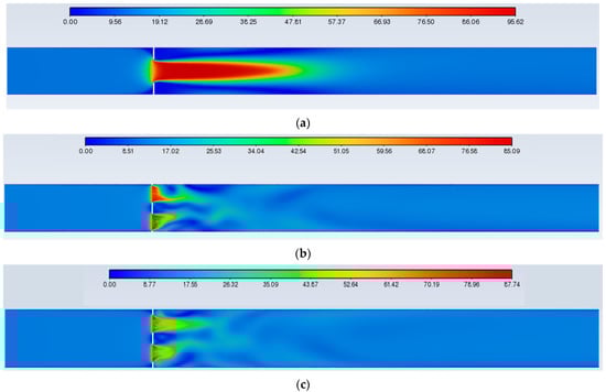 Velocity contours for orifices: (a) standard, (b) slotted 1, (c) slotted 2.