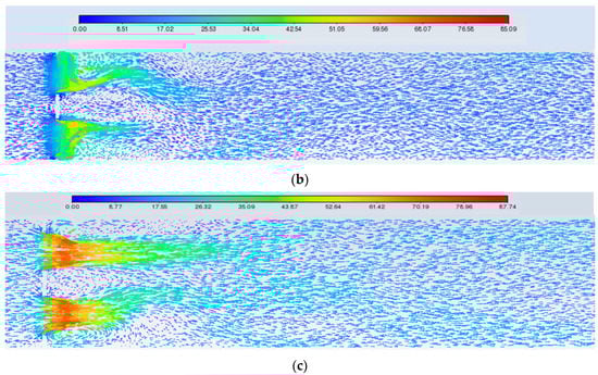 Velocity vectors for orifices: (a) standard, (b) slotted 1, (c) slotted 2.