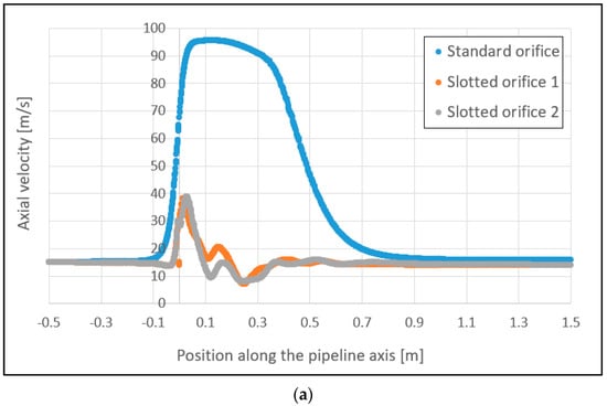Distribution of velocity (a) and pressure (b) in the pipeline axis showing comparison of standard orifice and slotted orifices.