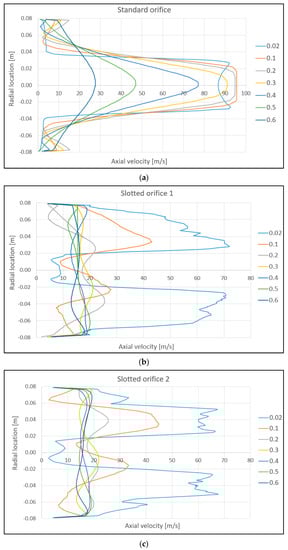 Comparison of velocity profiles at different distances behind the orifices: (a) standard, (b) slotted 1, (c) slotted 2.