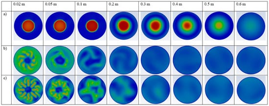 Velocity contours in different planes at specific distances behind (a) the standard orifice, (b) slotted orifice 1, (c) slotted orifice 2.