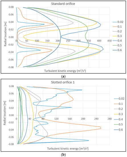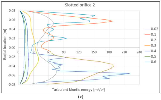 Comparison of radial profiles of turbulent kinetic energy for orifices: (a) standard, (b) slotted 1, (c) slotted 2.