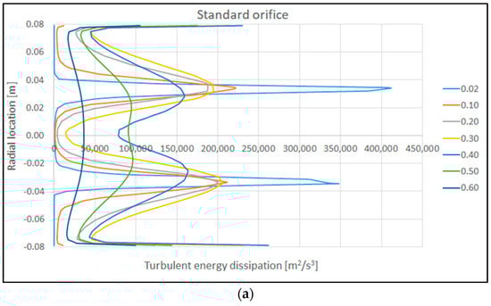 By analyzing the above graphs, it could be seen that the turbulence kinetic energy was highest for the standard orifice, where the maximum value of turbulence kinetic energy was about 420 m2/s2. This maximum value was observed at a distance of about 40 cm behind the orifice. In the case of the standard orifice, such a distribution of kinetic energy values in the different planes was due to the presence of a large velocity gradient at the periphery of the stream. The kinetic energy of turbulence reached maximum values at the periphery of the stream of flowing fluid, while in the center of the stream, the kinetic energy in individual sections reached minimum values, which was due to the conversion of pressure to velocity in the throat of the flow.