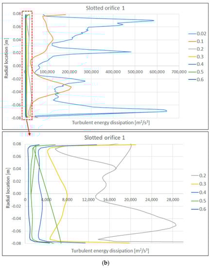 It was also observed that moving away from the slots, the average turbulence energy dissipation rate for slotted orifices 1 and 2 decreased comparably. In the case of slotted orifices, energy dissipation began directly and at a slight distance behind the orifice. At the same time, the value of the kinetic energy dispersion coefficient was higher for slotted orifices compared to the standard orifice. This was due to the increase in the number of flow holes in the slotted orifices. The obtained results on turbulence kinetic energy and energy dispersion led us to the conclusion that one of the most important differences between the studied orifices was the length of the developing turbulent region behind the hole, which was significantly shorter for slotted orifices.