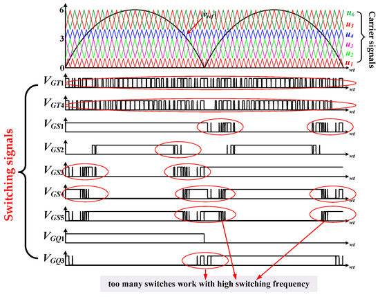 On the other hand, the modulation method also significantly affects the power quality of the multilevel inverter. The modulation strategy of the multilevel inverter includes high-frequency modulation and fundamental frequency modulation (FFM). High-frequency modulation, which uses triangular carrier wave to determine the output, is employed more widely than FFM because it reduces the THD of the output and makes the filter design easier. However, the frequency of the triangular carrier signal in HFM is always much higher than the fundamental frequency. This leads to many switches, including those with high blocking voltage, operating at a high switching frequency. As a result, it will increase the switching loss of the inverter significantly. Taking [18] as an example, the modulation strategy as well as the switching signal proposed in this paper is demonstrated in Figure 1. It can be seen from the figure that all the switches except Q1 operate at a high switching frequency, among which S1, S2 and S3 have high blocking voltage (3 Vdc). If the frequency of the carrier signal increases, the switching loss of the inverter will increase significantly and may become unbearable.
