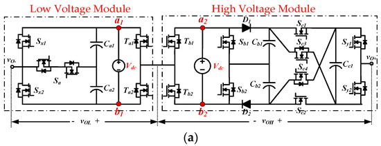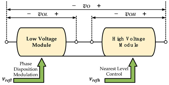 It is worthwhile to mention that the hybrid modulation method is only applicable to specific SC topologies. Therefore, it is necessary to explain what kinds of SC topology is suitable for the modulation strategy. As is shown in Figure 2, the generalized topology should contain a high-voltage module (HVM) and a low-voltage module (LVM). The capacitor voltage in HVM is often very large so as to achieve high boosting gain. The capacitor voltage in an LVM is equal to the minimum step voltage of the output, and the blocking voltage of the switches are low. In Figure 2, vOH and vOL represent the output voltage of the HVM and LVM, respectively. The whole inverter is formed by connecting the circuits of the HVM and LVM in series, and the output voltage of the inverter vo = vOH + vOL.