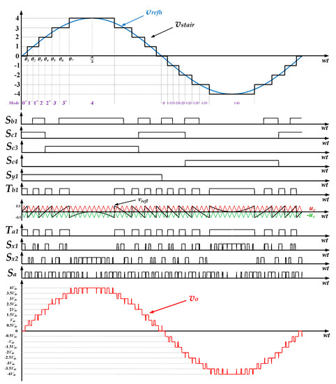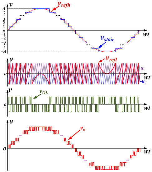 By comparing vrefl with two triangular carrier signals (uc and −uc) with a peak-to-peak value of 0.5, the output signal of LVM vOL can be determined. The amplitude of the vOL is the minimum step voltage of the inverter. Finally, the entire inverter output vo is equal to the sum of vrefh and vrefl. Its waveform is shown in Figure 3.