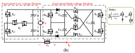 Figure 4 demonstrates a 17-level demo switched capacitor topology that conforms to the configuration mentioned in Section 2.1. In Figure 4a, switches Sx1, Sx2, Ta1, Ta2 and bi-directional switch Sa, DC power source Vdc as well as the capacitor Ca1 and Ca2 make up the low-voltage module. Other power devices make up the high-voltage module. The voltage of Ca1 and Ca2 are both rated at Vdc/2, the capacitor voltage of Cb1 and Cb2 are rated at Vdc and the capacitor voltage of Cc1 can be rated at 2 Vdc. The circuit in Figure 4a can be simplified into the topology in Figure 4b, which means the output voltage remains the same even if some power devices are removed. The equivalence principle will be introduced in detail in Section 3.2.