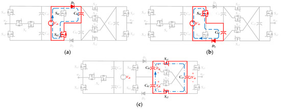 The voltage balance of capacitor in the HVM is achieved by imposing the rated voltage to the corresponding capacitors in various charging circuits. As is shown in Figure 6a, when Sb2 is turned on, D1 conducts and the capacitor Cb1 can be charged through the voltage of power source Vdc. As is shown in Figure 6b, when Sb1 is turned on, D2 conducts and the capacitor Cb2 can be charged to Vdc. As is shown in Figure 6c, when Sc1 and Sc2 are turned on, Cb1 and Cb2 are connected in series and their voltage is imposed to Cc1. Since the rated voltages of Cb1 and Cb2 are both Vdc, Cc1 can be charged to 2 Vdc through the charging circuit.