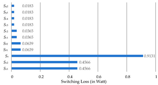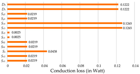 Figure 9 shows the conduction losses of various diodes and switches. The load current is still assumed to be Equation (10). The Vdc is still set to be 24 V and load is set as 200 Ω. The on-state resistance is set as 0.38 Ω and the forward voltage is regarded as 0.8 V. The output current is assumed to be the Equation (10). Therefore, the total conduction loss is estimated to be 0.6776 W.
