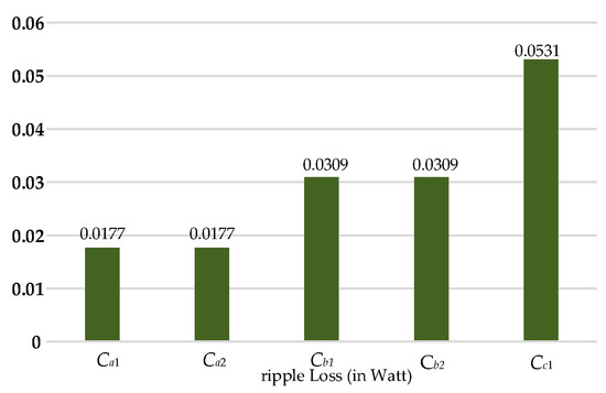 Figure 10 shows the ripple loss of various capacitors in the demo topology. The Vdc is still 24 V, and the load is still 200 Ω. The maximum voltage ripple of various capacitors can be calculated using Equations (9) and (12). And the total ripple loss is estimated to be 0.1503 W.