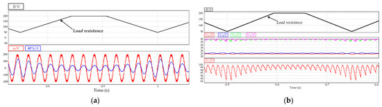 Figure 12a demonstrates the waveform of output voltage and current (amplified 40 times) under RL-load. The inductor is set as 46 mH. The resistance firstly increases from 50 Ω to 200 Ω, then it keeps constant and finally decreases linearly from 200 Ω to 50 Ω. It can be observed from the Figure that the output voltage is a 17-level staircase AC waveform with the amplitude of 200 V. The output current is a near-sinusoidal waveform. When the load increases, the amplitude of output current decreases gradually and reaches the lowest value at 0.98 A. After that, the load resistance reduces, and the output current rises correspondingly.