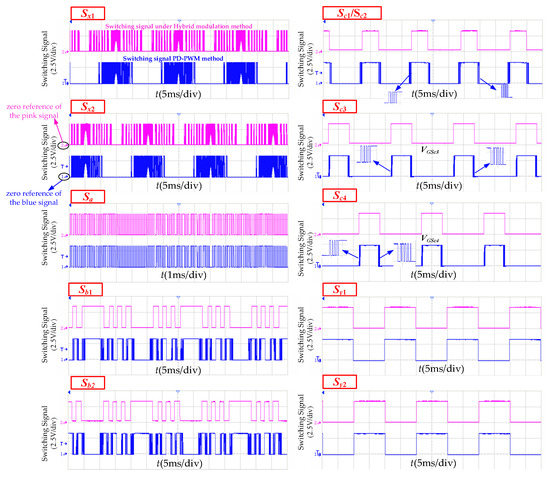 Figure 13 demonstrates the waveforms of the switching signals of each power switch under two different modulation methods: one is the hybrid method proposed in this paper (pink waveforms) and the other is the traditional phase disposition modulation method (PD-PWM) which is widely used in other papers [12,13,14,15,16] (blue waveforms). The two different modulations lead to different switching signals and, certainly, switching frequency.