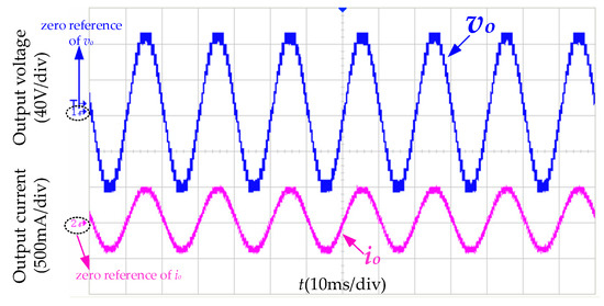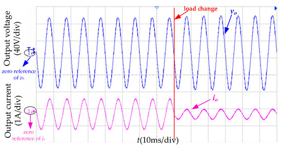 A load change experiment was carried out to examine the transient response of demo topology and modulation method. Figure 17 illustrates the output waveforms under the condition of a sudden load change from 80 Ω + 46 mH to 280 Ω + 46 mH. The output voltage remains unchanged while the output current reduces greatly because the load impedance increases. The results in Figure 17 show the proposed demo topology and modulation method have good dynamic responses.