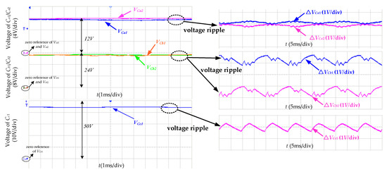 Figure 15 illustrates the capacitor voltage as well as the voltage ripple. As is shown in the Figure, the voltages of Ca1 and Ca2 are steady at 12 V with a voltage ripple of 360 mV. Vcb1 and Vcb2 are stable at 24 V. Their voltage ripple is measured to be 960 mV. The average value of VCc3 is 45 V, which is a bit lower than its desired value (48 V) because of the forward voltage of diodes and parasitic resistance in the power switch. From Figure 15, it can be observed that all the capacitor voltages are self-balanced and their voltage ripples are all within 10% of their rated voltage.