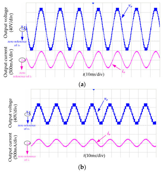 Figure 16 presents the output voltage and current under 200 Ω + 46 mH inductive load. The modulation index is set to be 0.98 in Figure 16a and 0.45 in Figure 16b. As is shown in the Figure, when the modulation index reduces from 0.98 to 0.45, the number of the output level decreases from seventeen to nine, and the amplitude of io reduces correspondingly. The current THD in Figure 16a,b is 2.09% and 2.6%, respectively.