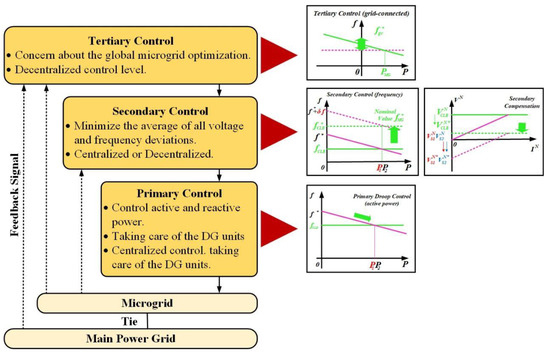 The hierarchical control architecture (HCA) also coordinates the activities of the grid-following and -forming units in 1Ø-µGs. The µG-HCA is separated into 3 sections, with diminishing frequencies as one moves up the hierarchy, as depicted in Figure 1 [52,53,54,55,56,57,58]. Typically, control algorithms that address particular PQ issues are implemented in one or a mix of these levels. Since the tertiary level is often not linked with the functioning of 1Ø-µGs, only the primary control (PC) and secondary control (SC) mechanisms for DGs are analyzed in this review.