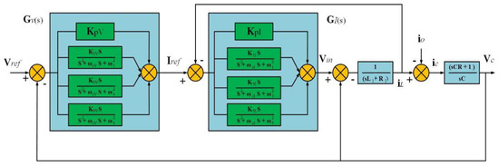 Alternatively, linear harmonic controllers (HCs), proposed in [116,129,130,131], were utilized to alleviate VαI harmonics in µGs. The applied controllers were proportional resonant (PR) with low impedance at the harmonic F (HF) under consideration. Ref. [116] examined selective HC using PR controllers in 1Ø-µGs. The inner VαI loops are controlled by PR controllers with selective HC, as depicted in Figure 2. Each controller’s transfer functions (TFs) are stated as follows: