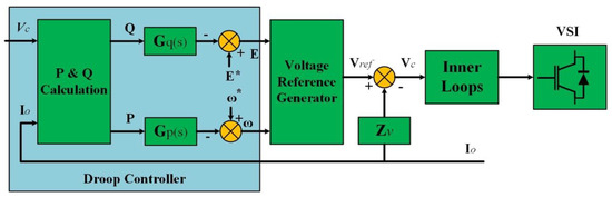 Other PC approaches suggested for improving the PQ of 1Ø-µGs are built on the impression of VI loops (VILs). VILs can be implemented in both 1Ø and 3Ø-µGs. R or L, RL, and RC are the emulated VI in [116,132,133,134]. As shown in Figure 3, the VIL is unified into the PCLs of the DGs. Multiplying the VI’s Z V by the output I ( i o ) and additional to the desired V from the DC loop ( V r e f ) to attain.