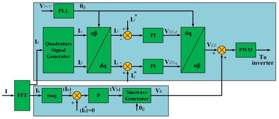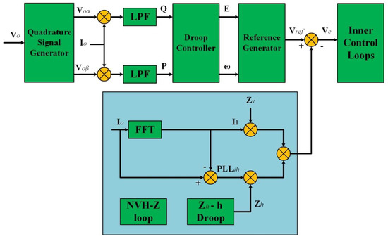 As shown in Figure 5, an adaptive negative virtual harmonic impedance (NVH-Z) loop to reduce I’s harmonic in µGs was investigated [138]. A fast Fourier transform (FFT) function was applied to obtain the fundamental current and harmonic components   I o and   I h . The harmonic component and fundamental component were multiplied by   Z h , and   Z V , respectively. The   Z h value was adjusted by an algorithm for controlling harmonic droop, which is defined by the next equation [132,133]:
