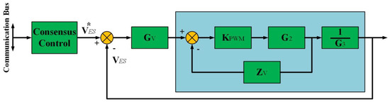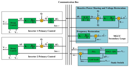 In [118,139], the authors proposed an HCA in which the µG central controller (µGCC) regulates the µG’s VαF. The µGCC restores VαF by cascading the CLs of the DGs in the µG with PI control. Since SCLs are not essential to the operation of the µG and serve only to optimize its operation, only a low-bandwidth communication (LBC) connection is essential. However, because the Q is not accounted for in the choice of V compensation factors, these SCLs may increase the Q exchange flanked by DGs. In [140], Q sharing in islanded µGs using adaptive V-DC [141] and SCLs that eliminate Q exchange between DGs in 1Ø-µGs and simultaneously regulate VαF were examined. In [136,142], a Q-sharing block (SB) was added to the µGCC to eliminate the Q exchange between the inverters. As shown in Figure 6, the Q-SB was used with the VR loop. The µGCC determined the Q demand for each inverter, enabling per-unit Q sharing. In this instance, LBCs were applied to spread the pertinent work. In [140], additionally, the process took the limited quantity of power that could be obtained from the power source into consideration.