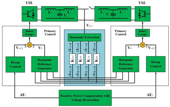 In [46,133], the PCC’s voltage HC was also taken into account. The authors in [46] proposed the HCA depicted in Figure 8, which reduces Q exchange and regulates VαF. The value and polarities of the voltage harmonics are extracted by a large number of second-order generalized integrators and diffused to the µGCC. To calculate the required harmonic correction by the DGs at the µGCC, a controller is employed for each harmonic.