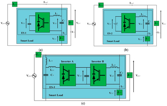 The primary ES configuration was covered in [150], and it has recently been referred to as ES-1 [151,152,153]. As illustrated in Figure 9a, ES-1 is linked in series with Z n c and is made up of a half-/full-bridge 1Ø converter with a capacitor. The ES-1 in [143] operates in three different ways that are reliant on the accessibility and need for electrical P in the area. V p c c is within the usual working range when the power production and load need are equal; hence, the ES-1 does not take part in DCM. It increases or decreases based on the relationship between power production and load request. An L/C voltage ( V e s ) is fed by ES-1 to keep the desired V p c c via the control of V n c . The ES-1’s functioning causes the SL to provide restricted Q compensation, which controls the µG voltage, but it suffers from V e s and should be 90° leading/lagging i S L .