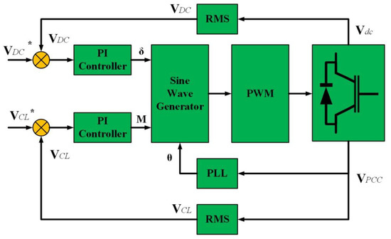 The ES-1’s PCL comprises two closed CLs that regulate the value and phase angle (PA) of v E S [143]. Figure 10 illustrates the PCL’s configuration of the ES-1. The value of | v E S | directly controls the Q output of the ES-1, whereas the PA ( v E S = q E S ) between v E S and i S L controls the used P. For minimizing the ES-1 P’s input/output, the 2CLs regulate the DC-link voltage. Ideally, it should not matter if some P flow is required to control the V’s DC link (DCL). Additionally, the ES-1’s Q compensation capabilities are constrained by the stored energy in the DCL capacitor.