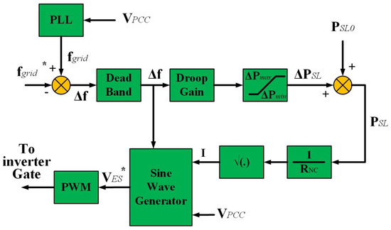 For providing resident V support, ESs with DCM capabilities could also provide F regulation. Ref. [82] proposed an algorithm that enables an ES-1 to control the primary F. Figure 11 is a block diagram of this CL, which regulates the value and PA of the ES-1 v E S based on Δ F . Consequently, the needed P consumed by the SL (PSL) is calculated as: