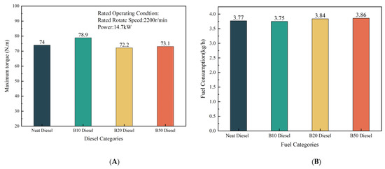The maximum torque and fuel consumption compared to biodiesel blends. (A) Maximum torque; (B) Fuel Consumption.